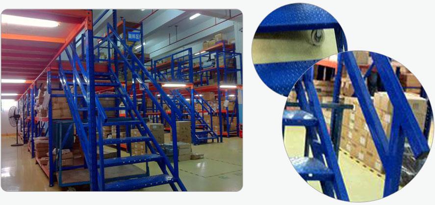 3. 平臺必須配備樓梯,以方便員工在二樓工作。藍(lán)色部分是入口和出口,叉車可以輕松將貨物運入或運出。護(hù)欄沒有墻壁,高度為 1050mm,是安全高度(超過高度的一半),可確保不會發(fā)生人員安全事故。